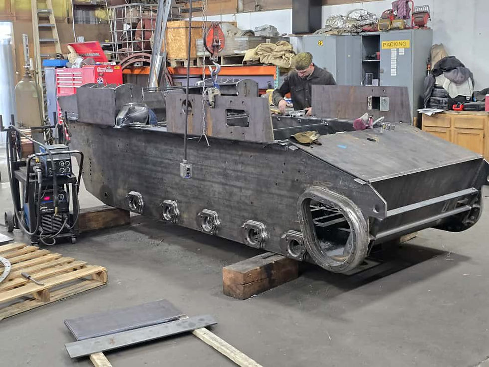 After the hull was basically complete and together... out everything has to come. Alpha stripped out to start on the Aufbau. Dave is bolting up the floor of the sponson area of the aufbau.
